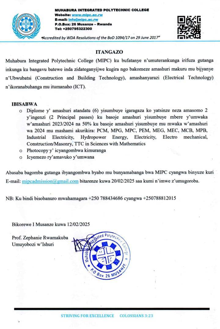 abo bari bagiye gukomereza masomo yabo mu imenyerezamurimo bari baratangiye kwiga kuva ku19/08/2024 bageza kuwa 20/12/2024 (nkuko bisanzwe ko biga amezi4 theory na practice mu ishuri maze bakajya mu imenyerezamurimo naho bakigayo andi mezi 2) bivuzeko basoza isomo ryabo bize amezi 6.
